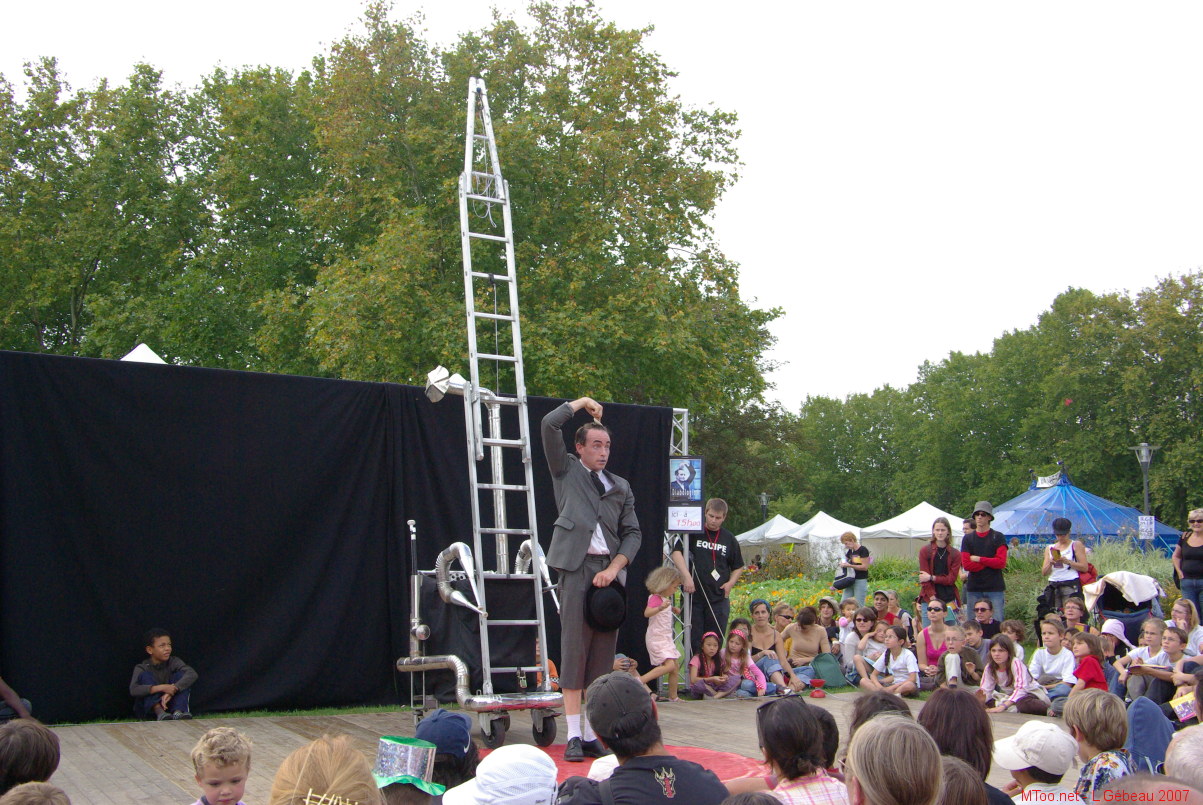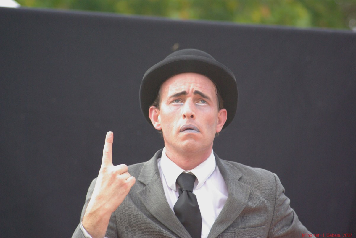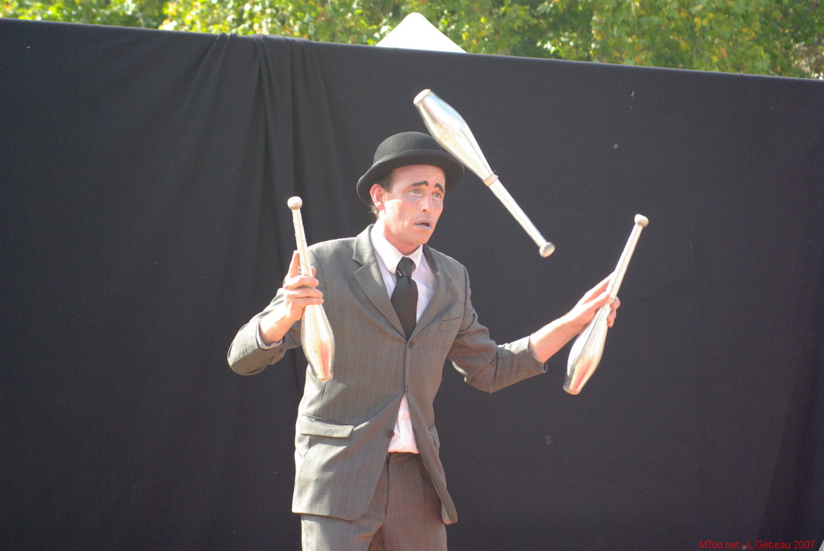 Cirkologium, un clown gris à l'air mélancolique. Nous avions déjà vu Cirkologium en 2003 (cf http://photosmtoo.com/95/cergy/cergy-soit/index.htm), le spectacle s'est enrichi et professionnalisé. |