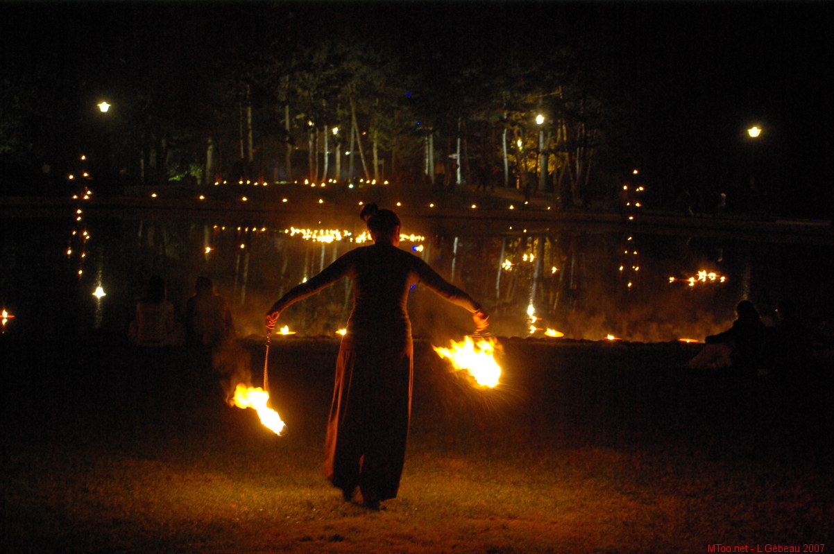 scintillent et se reflètent dans l'eau. Les nombreux jongleurs rivalisent d'adresse et se dispersent autour du bassin. |